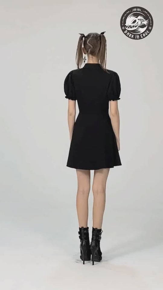 Vestido curto e preto com mangas curtas e largas. A frente apresenta um tecido vermelho em forma de coração com botões vermelhos que adicionam um toque distintivo. Confeccionado com uma mistura de alta qualidade de 95% poliéster e 5% spandex, este vestido oferece conforto e estilo para um look gótico, alternativo e punk. Destaca-se em qualquer ocasião com este vestido único e versátil que te permite expressar a tua individualidade. O design original e os detalhes em vermelho acentuam a personalidade audaz deste vestido. Atreve-te a marcar tendência com este vestido indispensável para os amantes da moda audaz!