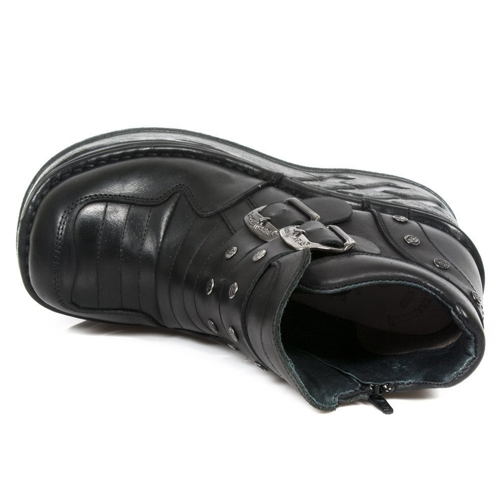 Descobre os sapatos New Rock pretos em pele com um design desportivo e um toque gótico distintivo. Estes sapatos New Rock apresentam tachas, duas fivelas no lado exterior e um fecho éclair no lado interior para um ajuste seguro e estilizado. Com uma cana de 9 cm, uma plataforma de 5,5 cm e um salto de 12 cm, oferecem a combinação perfeita de estilo e conforto. Ideais para completar o teu look alternativo com um calçado que não passa despercebido.